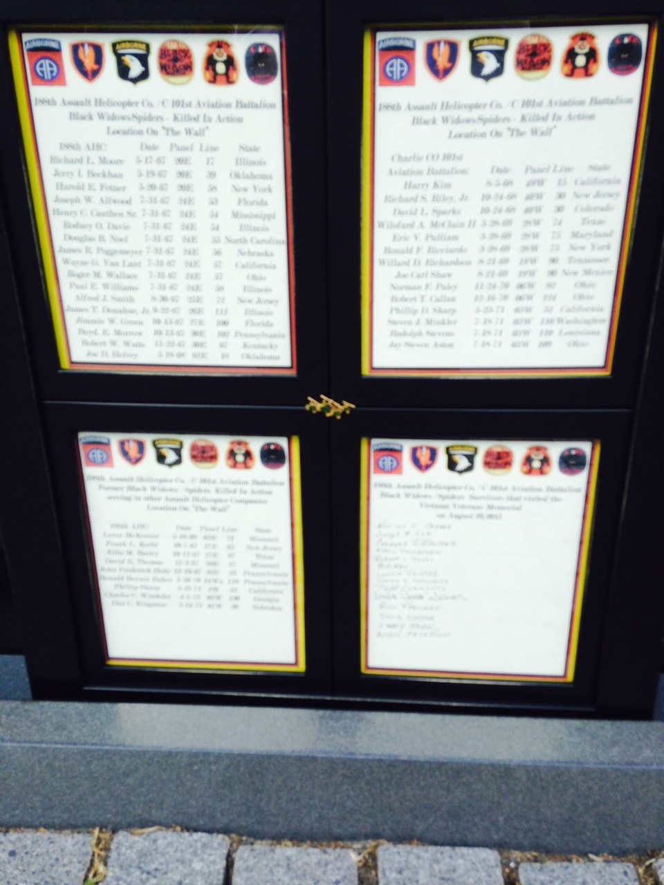 ![]() The Collage Plaque (to the left) with the names of our Black Widow fallen was left at the Wall to be placed in the Museum Present are: Kjell Tollefsen, Bob Janes, Bill Crabbe, & Joe Low A full Crew- Co-Pilot, Aircraft Commander, Door-Gunner & Crew Chief No one is ever forgotten |