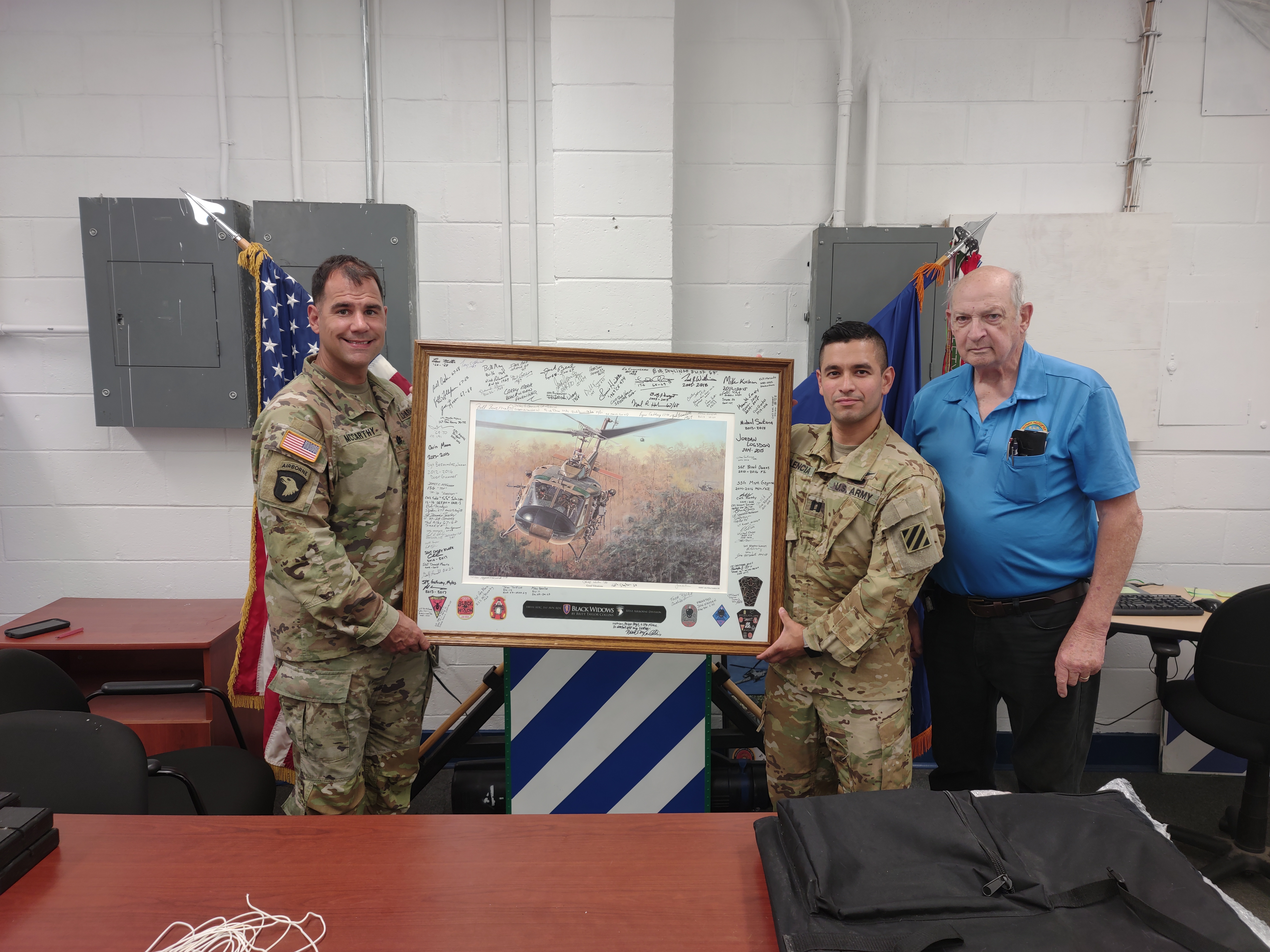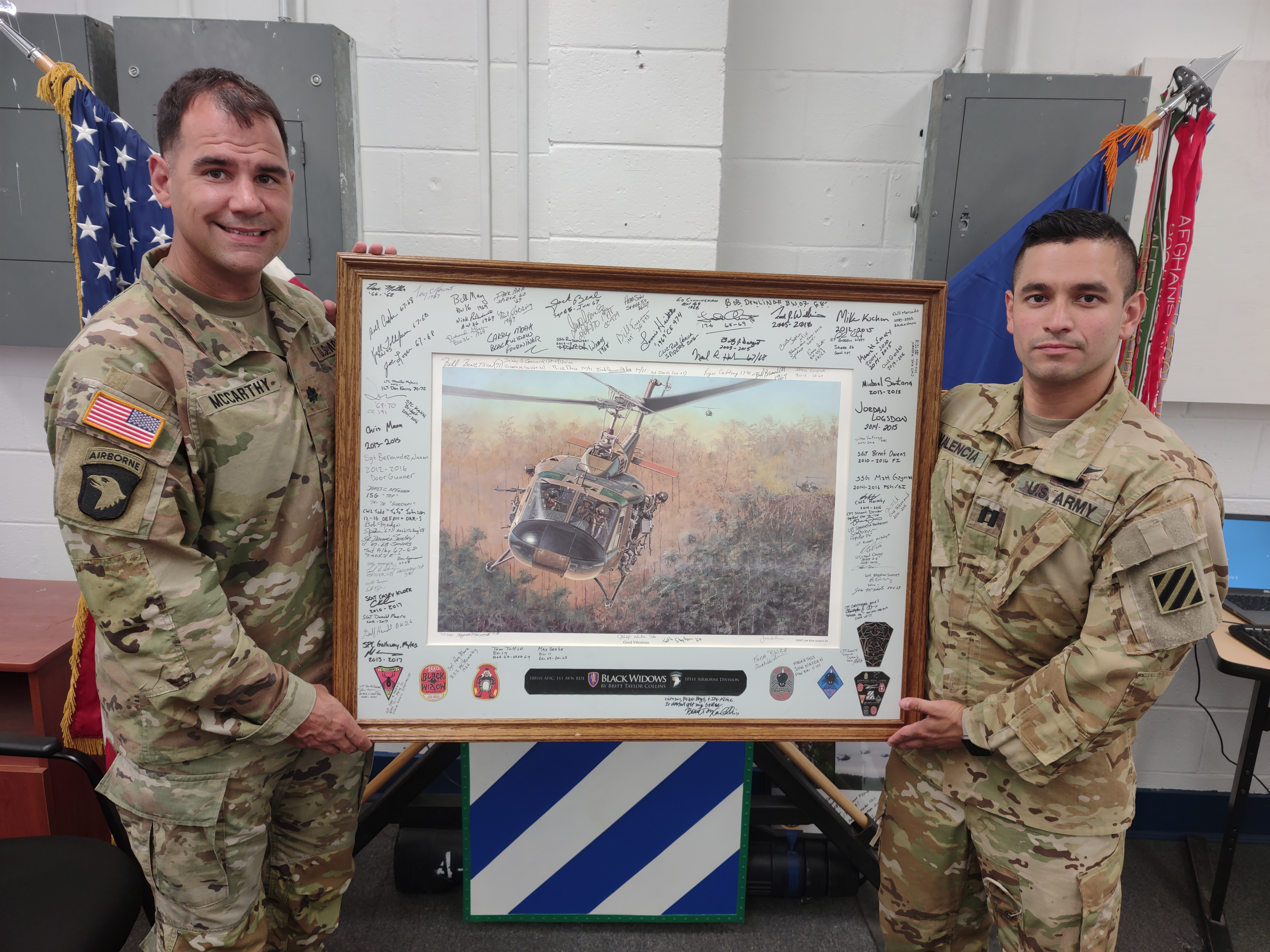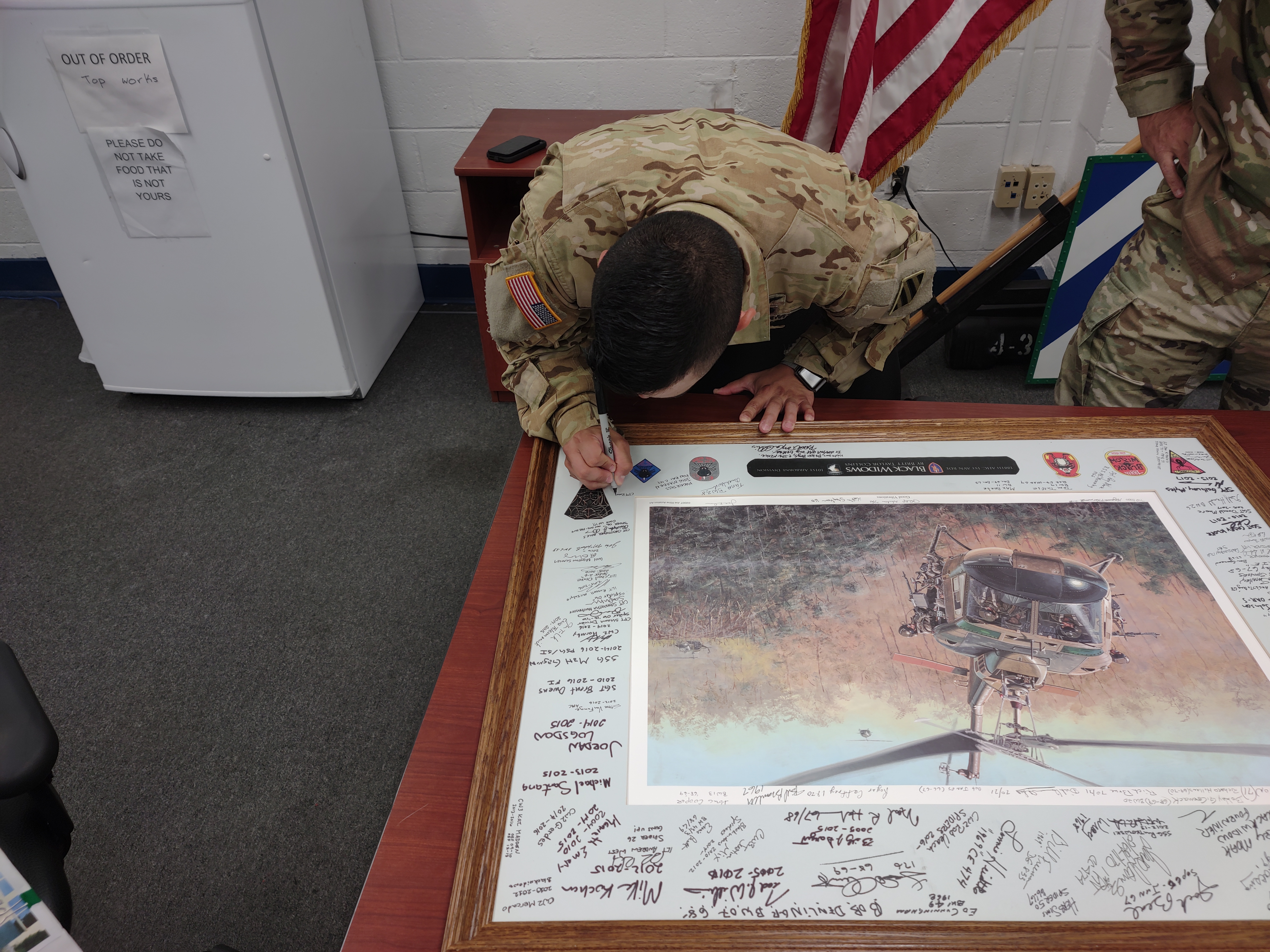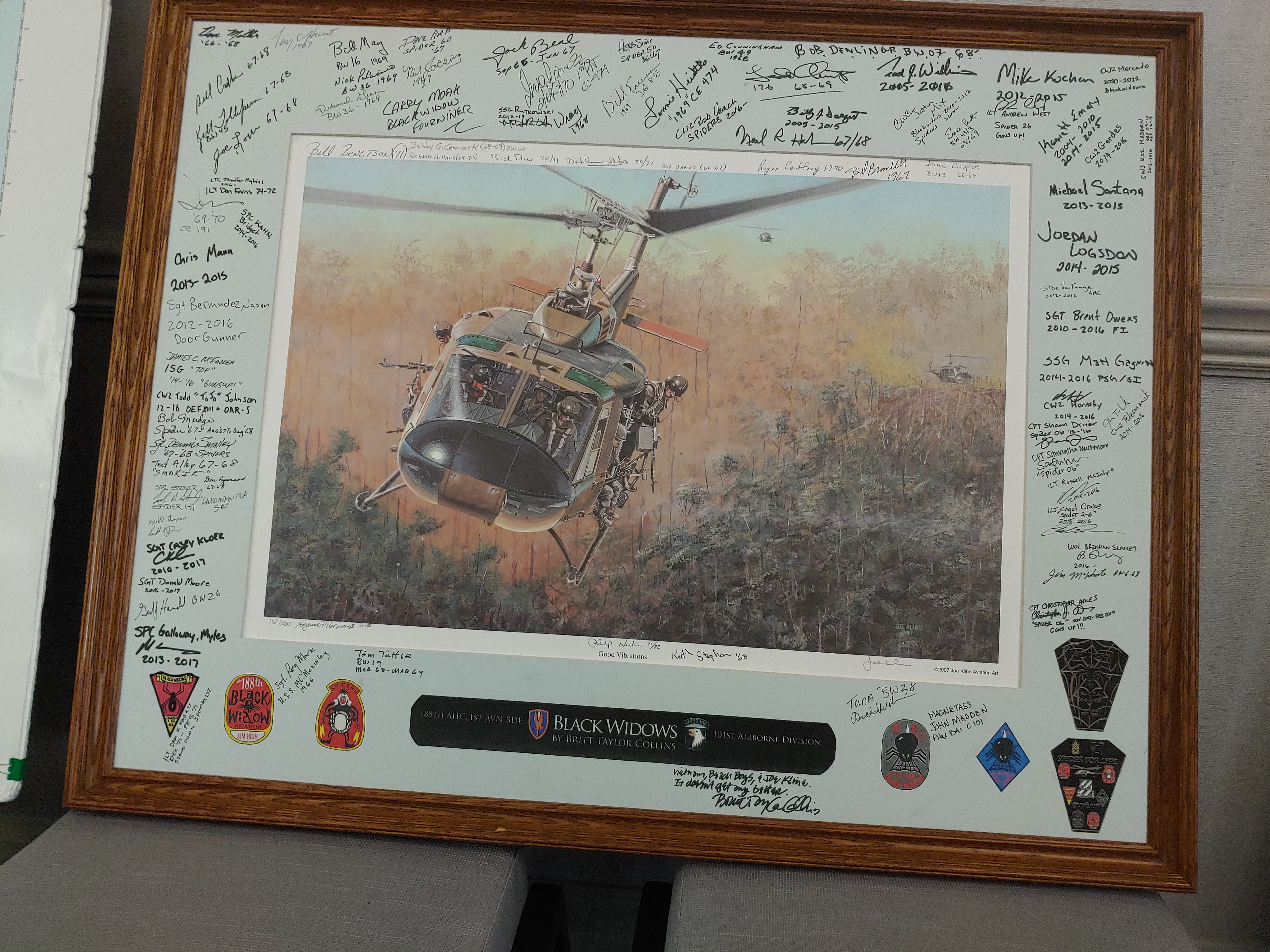 I met the BN Commander LTC Joe McCarthy who commanded the Black Widows (BW6) in 2010 at Ft. Campbell and the current Company Commander CPT, Raoul Valencia. I presented the Joe Low plaques, the banner and the Joe Kline picture with all our signatures to BN Commander and CO Commander. They will be displayed in the Spider Company Headquarters Legacy Room at Hunter AAF. During the presentation LTC Joe McCarthy signed the picture at the Black widow Logo and CPT Raoul Valencia signed at the Spider Logo. They are very happy to receive these and the CD,s that Richard Green supplied.