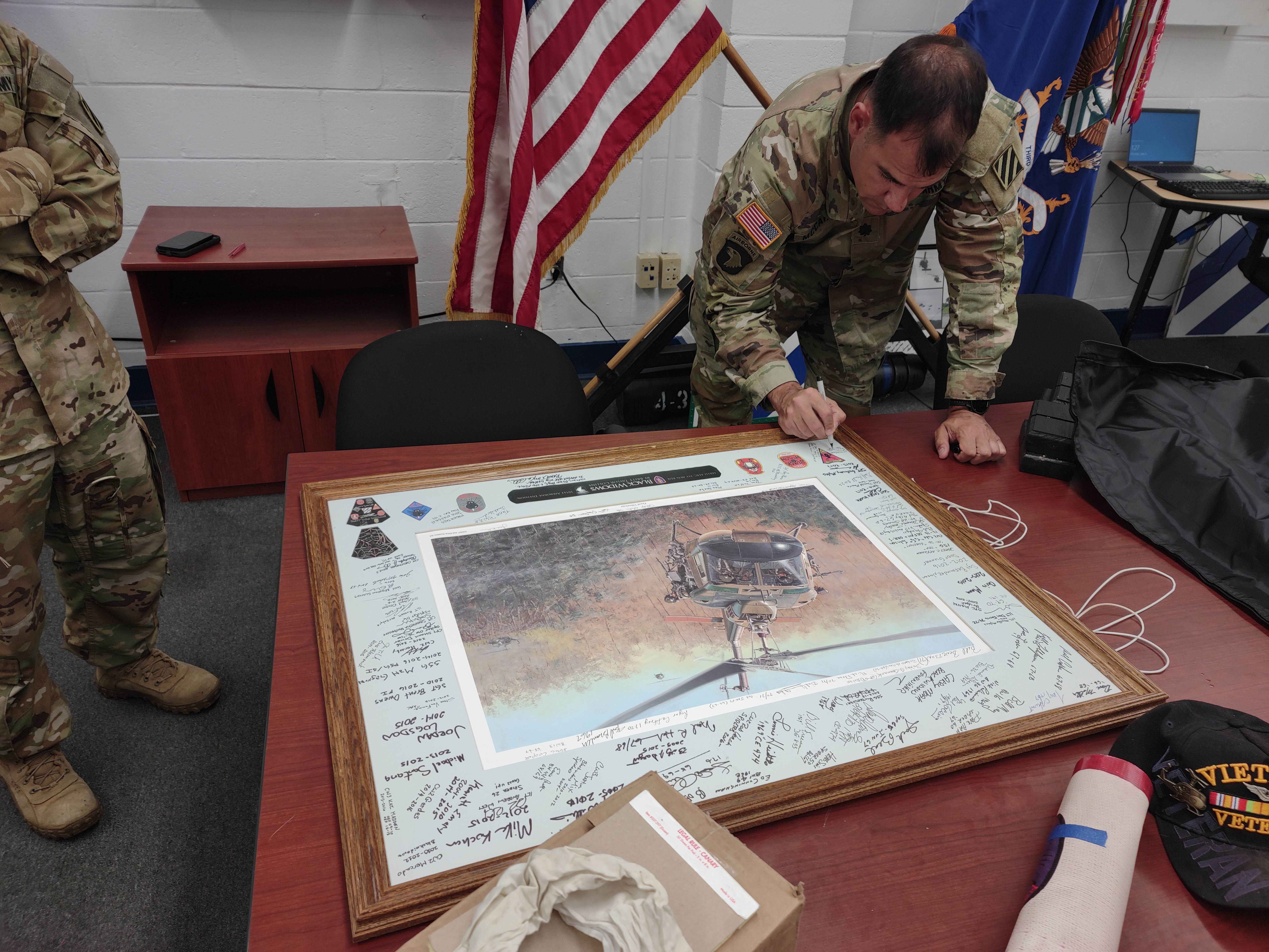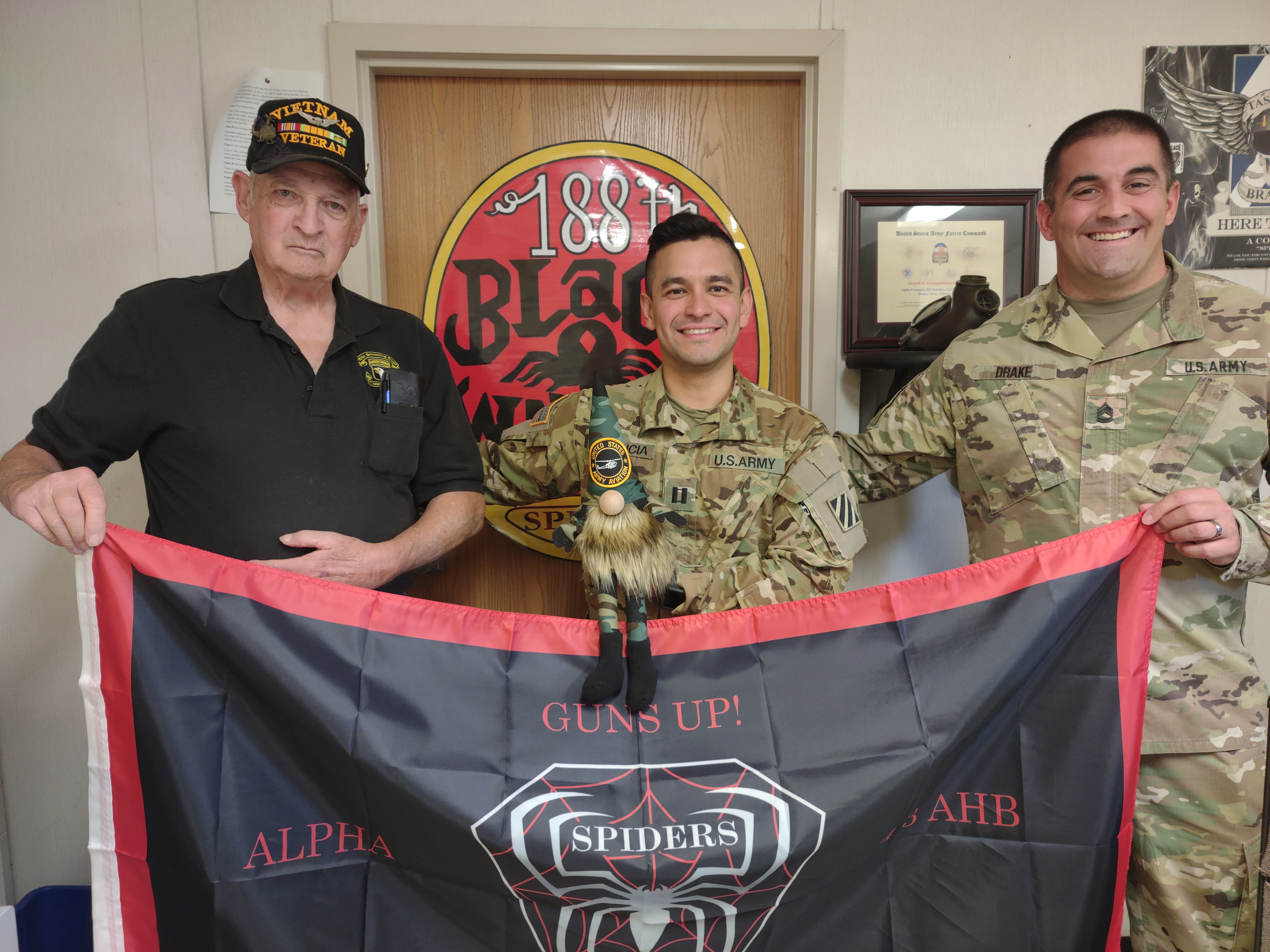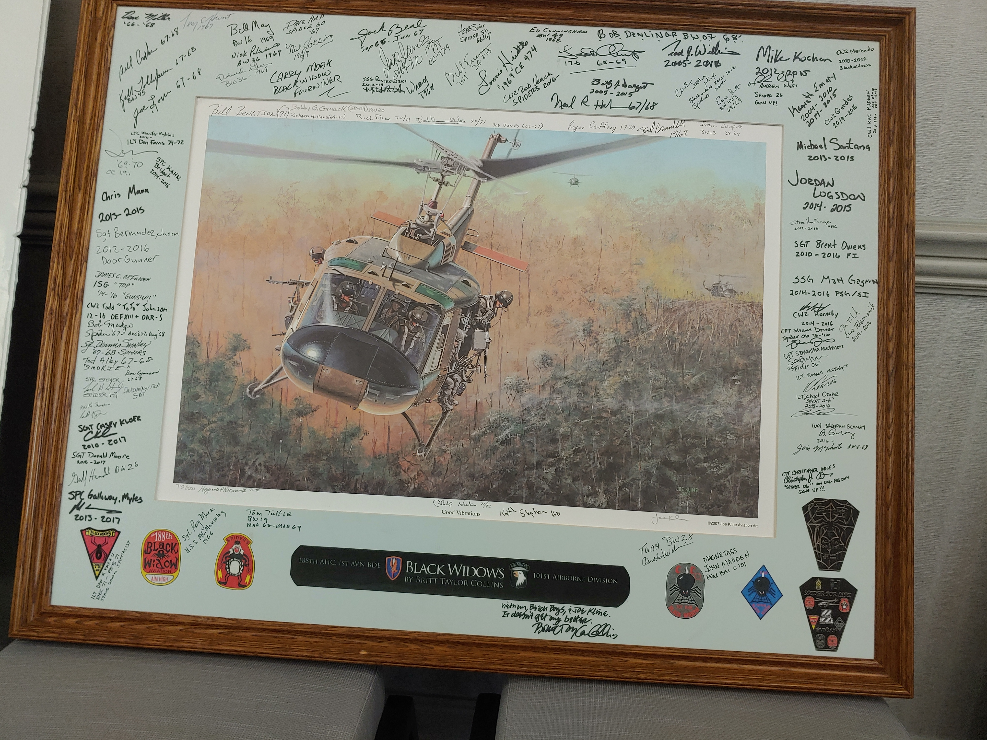 I met the BN Commander LTC Joe McCarthy who commanded the Black Widows (BW6) in 2010 at Ft. Campbell and the current Company Commander CPT, Raoul Valencia. I presented the Joe Low plaques, the banner and the Joe Kline picture with all our signatures to BN Commander and CO Commander. They will be displayed in the Spider Company Headquarters Legacy Room at Hunter AAF. During the presentation LTC Joe McCarthy signed the picture at the Black widow Logo and CPT Raoul Valencia signed at the Spider Logo. They are very happy to receive these and the CD,s that Richard Green supplied.
