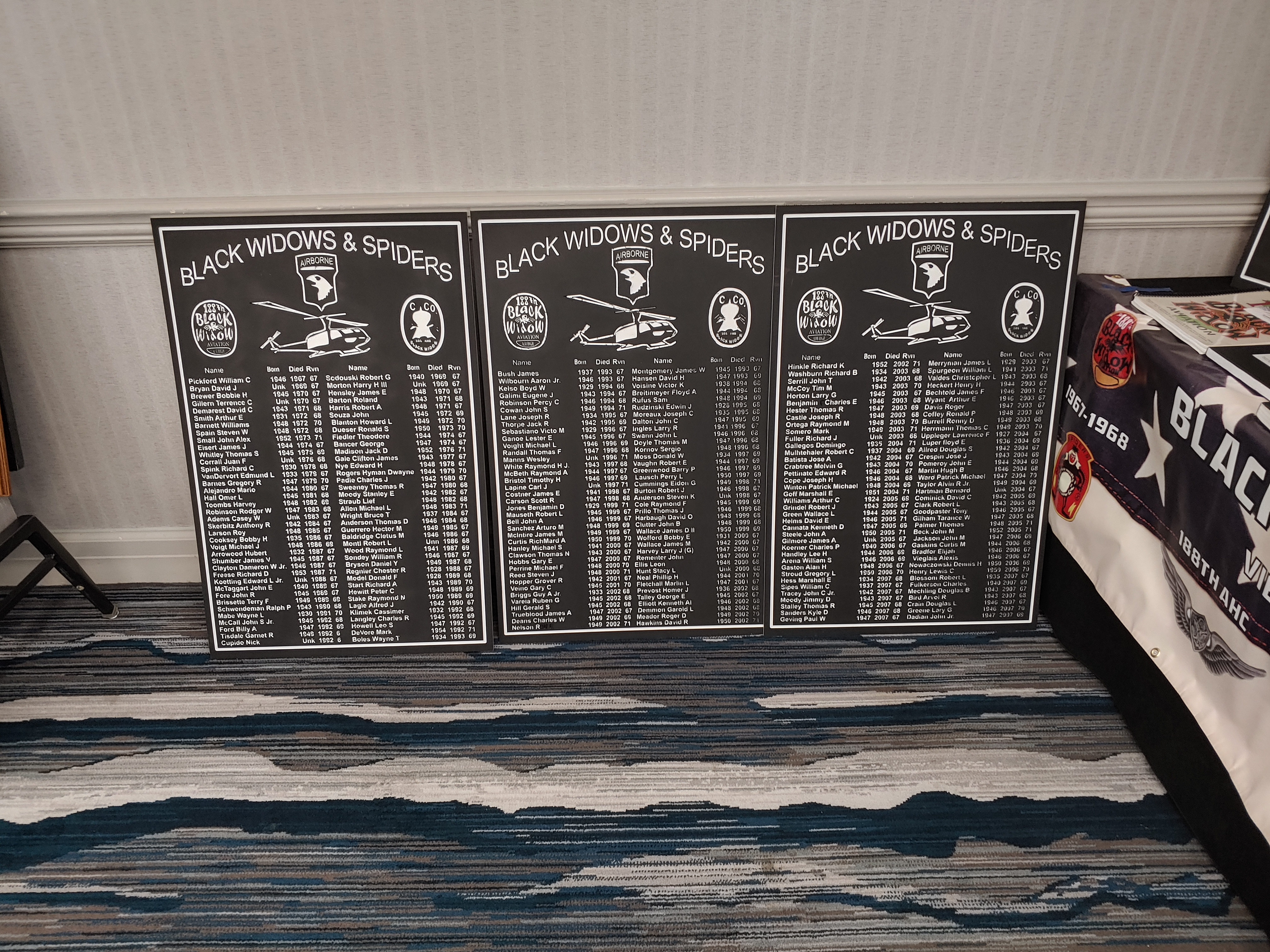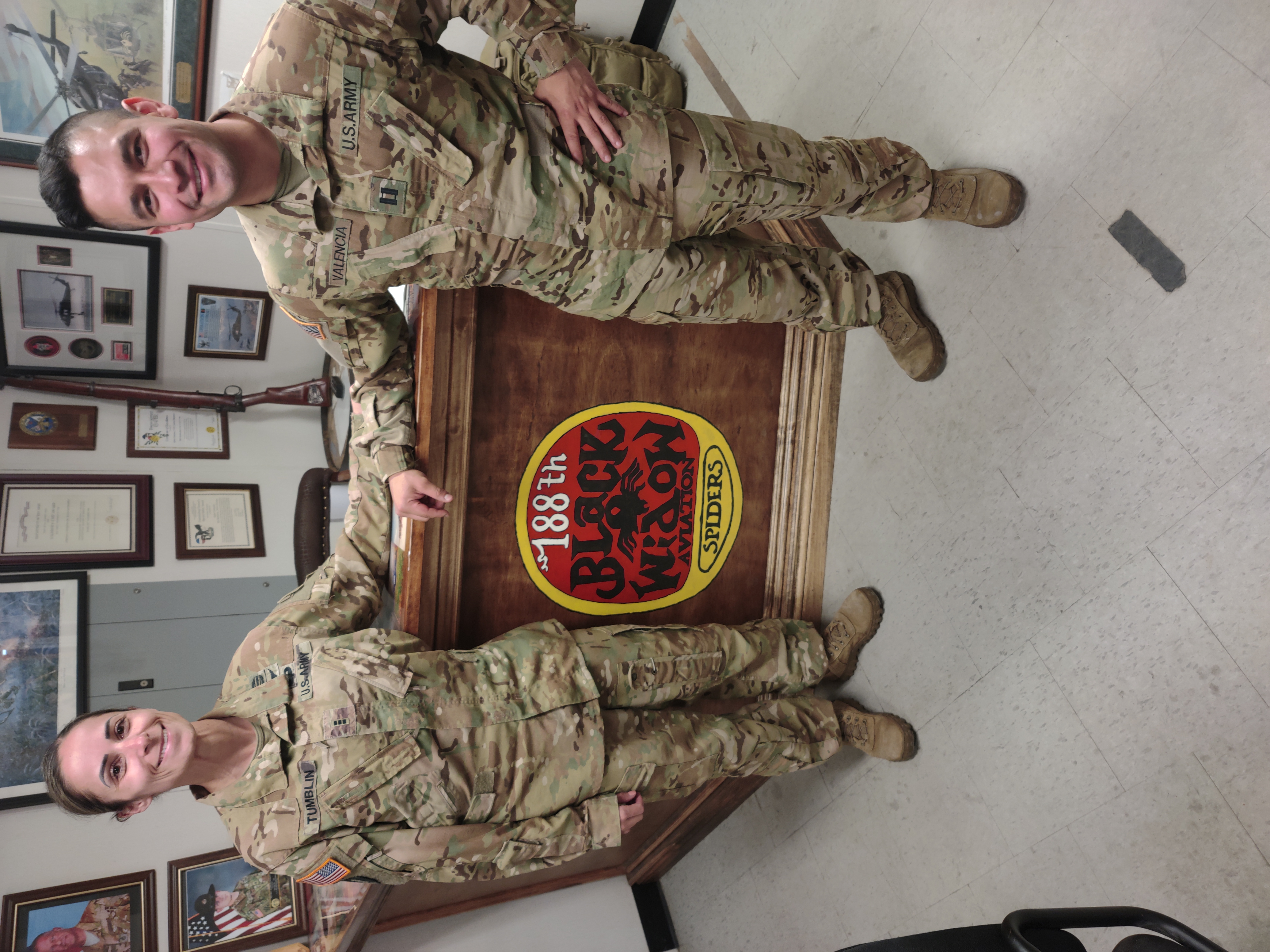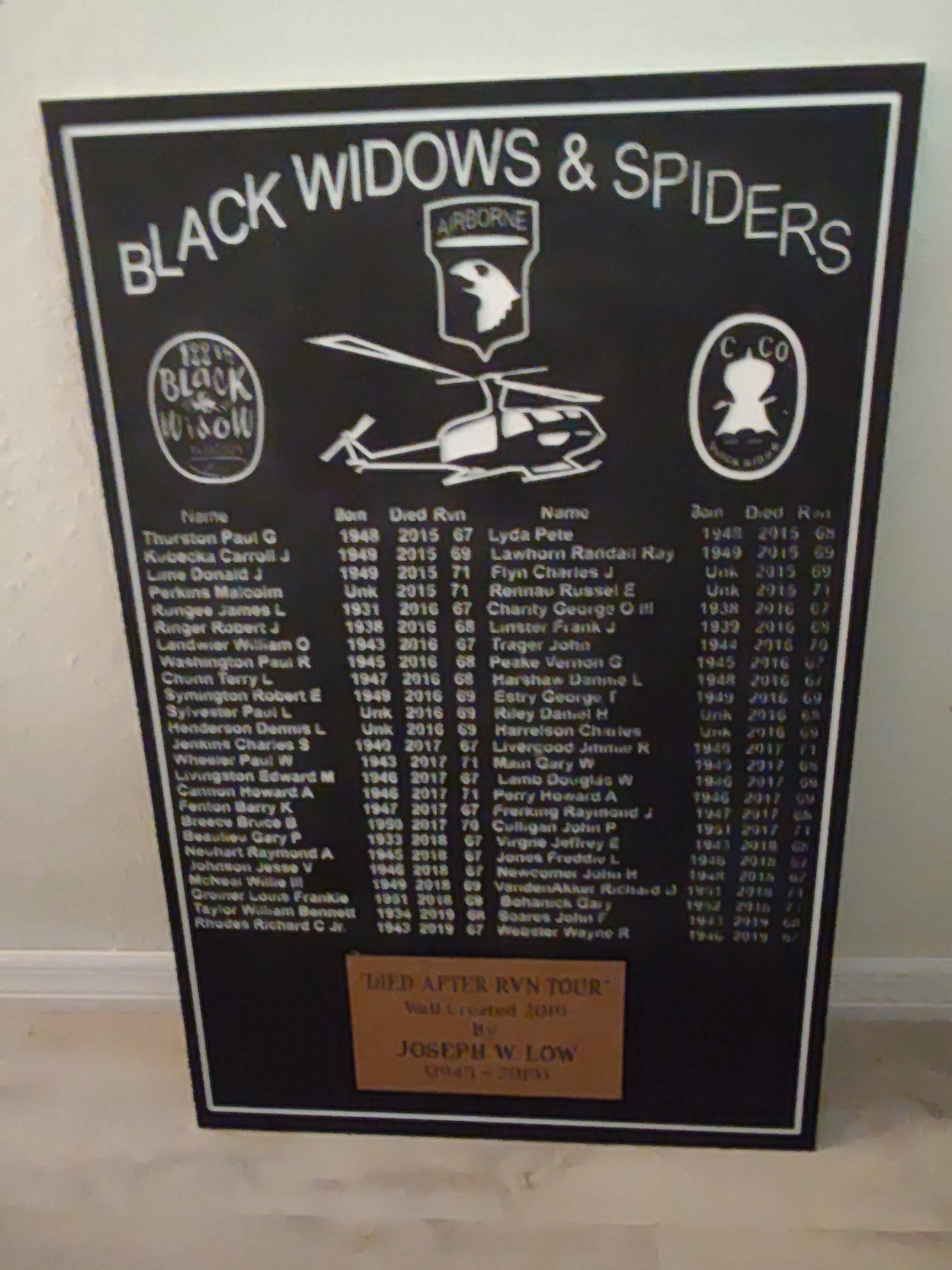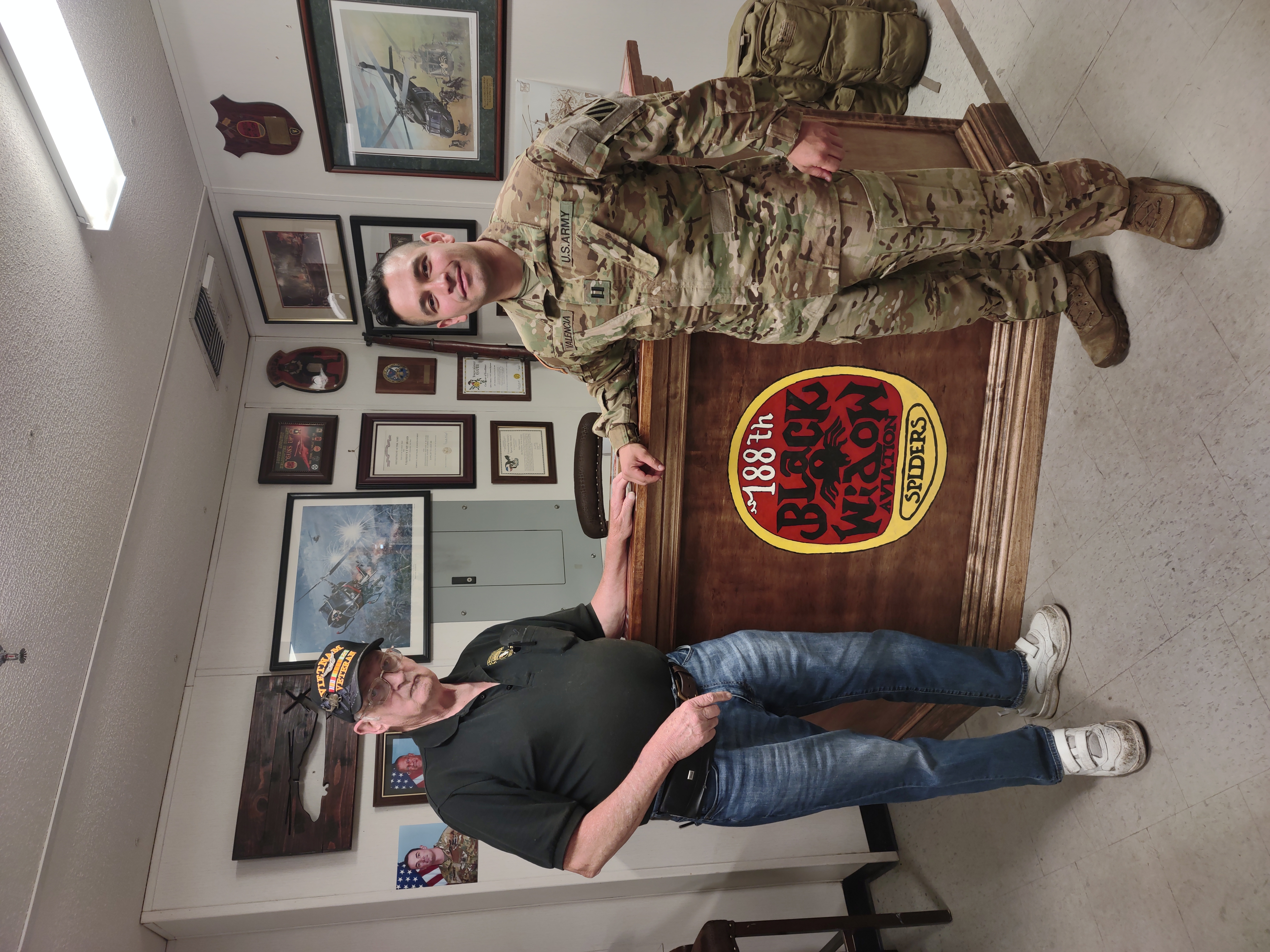 I met the BN Commander LTC Joe McCarthy who commanded the Black Widows (BW6) in 2010 at Ft. Campbell and the current Company Commander CPT, Raoul Valencia. I presented the Joe Low plaques, the banner and the Joe Kline picture with all our signatures to BN Commander and CO Commander. They will be displayed in the Spider Company Headquarters Legacy Room at Hunter AAF. During the presentation LTC Joe McCarthy signed the picture at the Black widow Logo and CPT Raoul Valencia signed at the Spider Logo. They are very happy to receive these and the CD,s that Richard Green supplied.